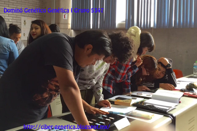En el grupo de Genética I, 5347, el día de hoy pusimos en práctica el obtener los cuatro tipos de gametas que pueden generarse a partir de un heterocigoto cuyo genotipo es AaBb, con ayuda del dominó genético generado por el grupo de Genética I 5220. Con ayuda de la alumna Diana Karen Ysimoto Monroy se llevo acabo este ejercicio práctico.